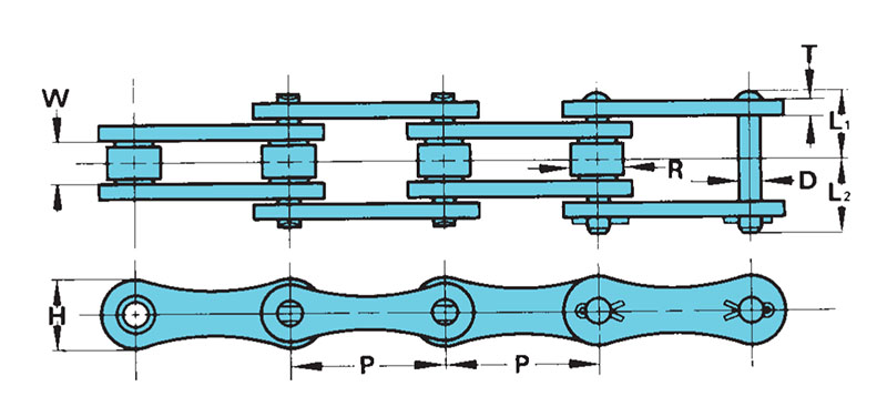 | A2080RB | N.º ANSI N/D 80 | P - Paso N/D 2.000 in | R - Diámetro del rodillo N/D 0.625 in | W - Ancho entre placas de eslabones de rodillo N/D 0.625 in | D N/D 0.312 in | L1 N/D 0.640 in |