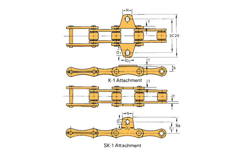 A corrente de transmissão agrícola é fabricada sob medida de acordo com as especificações do setor. Outros estilos de acessório estão disponíveis. Entre em contato com a U.S. Tsubaki para obter informações sobre acessórios especiais.