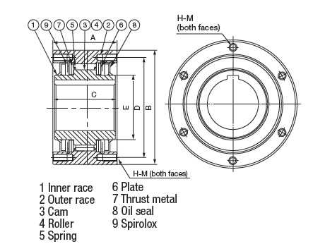 Um conjunto completo de embreagens de came normalmente inclui a embreagem de came, o braço de torque, a chaveta do eixo, a placa terminal do eixo e a tampa de segurança ou o reservatório de óleo. A chaveta do eixo está incluída na embreagem com came, mas selecione cada item adicional individualmente, conforme necessário. A lubrificação com graxa é padrão para as embreagens com came BS30 a BS350.