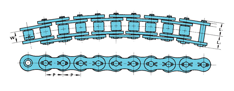 2. Uma folga maior entre pinos e buchas permite que as correntes acomodem um arco lateral de 4 polegadas e uma torção de 8 graus a cada 4 pés de corrente.