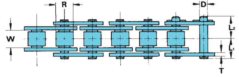 As correntes da série T têm maior resistência à carga de choque e maior resistência final à tração do que correntes de rolos com padrão ASME/ANSI comparáveis. Isso é conseguido usando pinos totalmente temperados. As dimensões das correntes são idênticas às das correntes de rolos padrão ASME/ANSI.