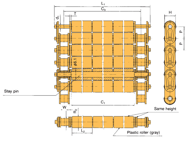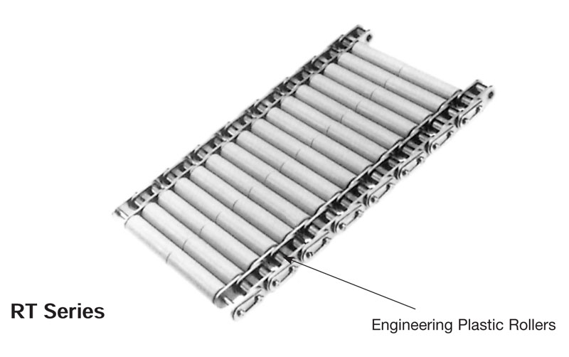 • A corrente de mesa de rolo do tipo RT oferece uma alternativa de baixo atrito à corrente de tampo de mesa.