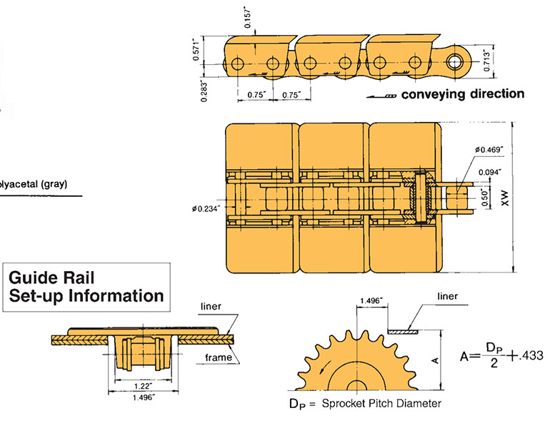| TN826NP-LAMBDA | P – Passo N/A 0.750 pol. | R – Diâmetro do rolo N/A 0.469 pol. | W – Largura entre as placas de conexão de rolo N/A 0.500 pol. | XW – Largura da placa superior N/A 4.000 pol. | Peso aproximado N/A 1.410 lb/pé | Carga máxima permitida de transporte N/A 1410 lb |